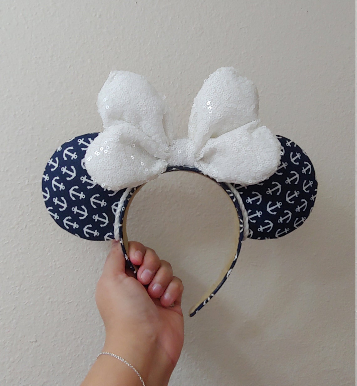 These pink ears have mini blue Mickeys all over, as well as a pretty blue beaded bow in the middle. These beautiful ears are blue and pink with sequins on the ears and a seashell bow in the middle. These white and black ears have scenes from the iconic cartoon on all sides.